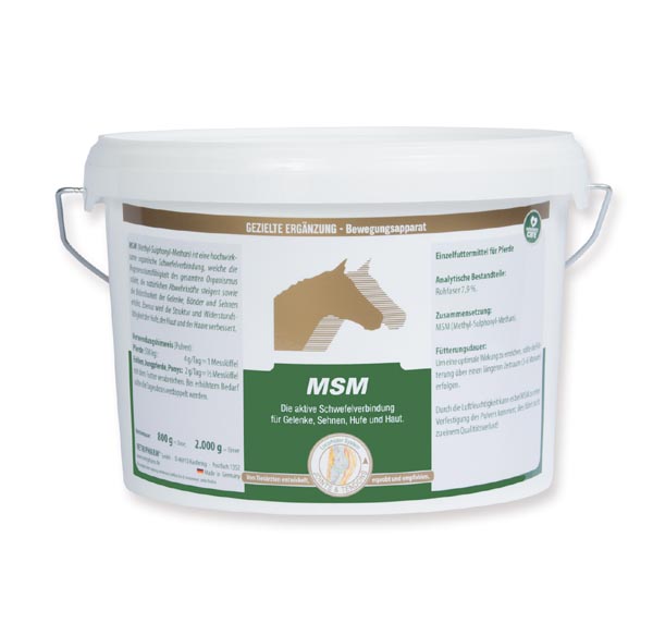 MSM (Methyl-Sulphonyl-Methan) ist eine hochwirksame organische Schwefelverbindung, welche die Regenerationsfähigkeit des gesamten Organismus stärkt, die natürlichen Abwehrkräfte steigert sowie die Belastbarkeit der Gelenke, Bänder und Sehnen erhöht. Ebenso wird die Struktur und Widerstandsfähigkeit der Hufe, der Haut und der Haare verbessert.